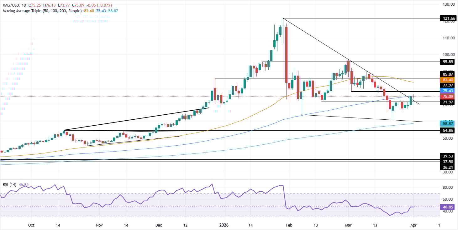 - Silver consolidates near $75 after failing to clear 20-day SMA.